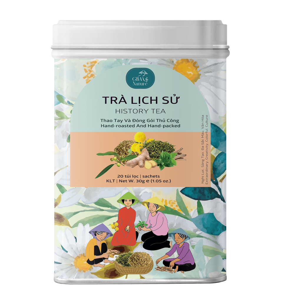 Stories of history become more engaging and profound when enjoying a cup of herbal tea with a combination of vibrant and energetic herbs, bright yellow chrysanthemum, lotus heart, specially rice grain, licorice, ginger root, mints with a recipe created from the traditional experience of skilled artisans and experts in herbs and nutrition, each cup of our tea contains a comprehensive blend of natural active ingredients, essential oils that nourish our health, bring inspiration for creativity and sympathy.